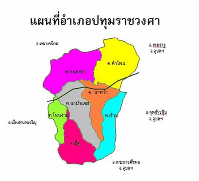 ทิศเหนือ ติดต่อกับอำเภอชานุมาน และ อำเภอเขมราฐ ทิศตะวันออก ติดต่อกับอำเภอเขมราฐ อำเภอกุดข้าวปุ้น