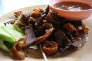 เป็นเครื่องในหมูปรุงกับเครื่องพะโล้ นำมาทอดรับประทานกับเต้าหู้ทอดราดน้ำจิ้ม มีร้านที่มีชื่อเช่น