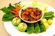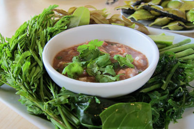 เป็นน้ำพริกกะปิตำใส่กุ้งเสียบ รับประทานกับผักสดต่างๆ มีขายตามร้านอาหารต่างๆ