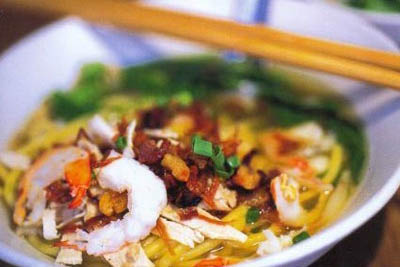 หมี่เหลืองอาจนำมาปรุงเป็นหมี่น้ำ หมี่แห้ง ด้วยน้ำซุปกุ้ง มีร้านอร่อย เช่น