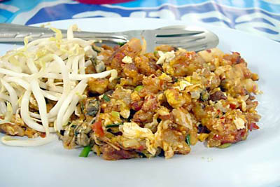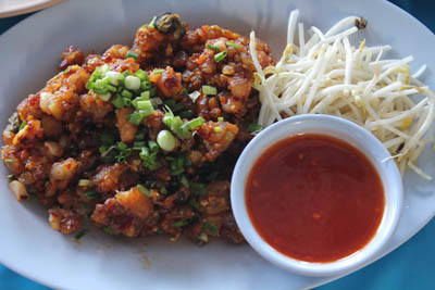 ลักษณะคล้ายกับหอยทอด แต่แป้งจะมีลักษณะนุ่มกว่า ใช้หอยนางรมตัวเล็ก ผัดกับแป้ง เผือก และไข่ ร้านมีชื่อเช่น